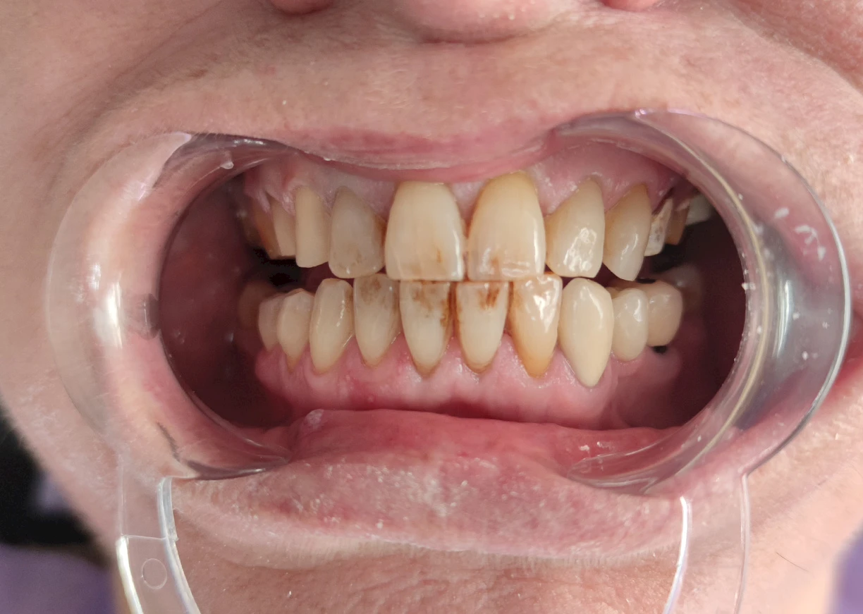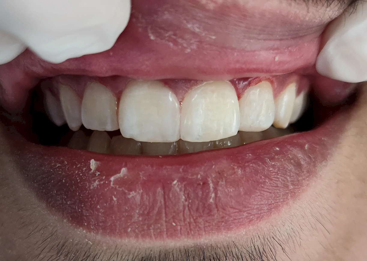 Dieses Foto zeigt den dramatischen Unterschied, den Laminatfurniere bewirken können. Das Vorher-Foto des Patienten zeigt, dass er mehrere verfärbte und deformierte Zähne hatte, was sich negativ auf sein Lächeln auswirkte. Das Nachher-Foto zeigt den Patienten, nachdem er Laminatfurniere erhalten hatte. Die Veneers haben die Zähne des Patienten aufgehellt und neu geformt und ihm ein schönes, natürlich aussehendes Lächeln verliehen. Erleben Sie die transformative Wirkung von Porzellanlaminat-Veneers mit Vorher-Nachher-Bildern, die eine verbesserte Ästhetik des Lächelns und korrigierte Zahnfehler zeigen. Erleben Sie den Selbstvertrauensschub und das strahlende Lächeln, die durch personalisierte Veneer-Behandlungen erreicht werden.