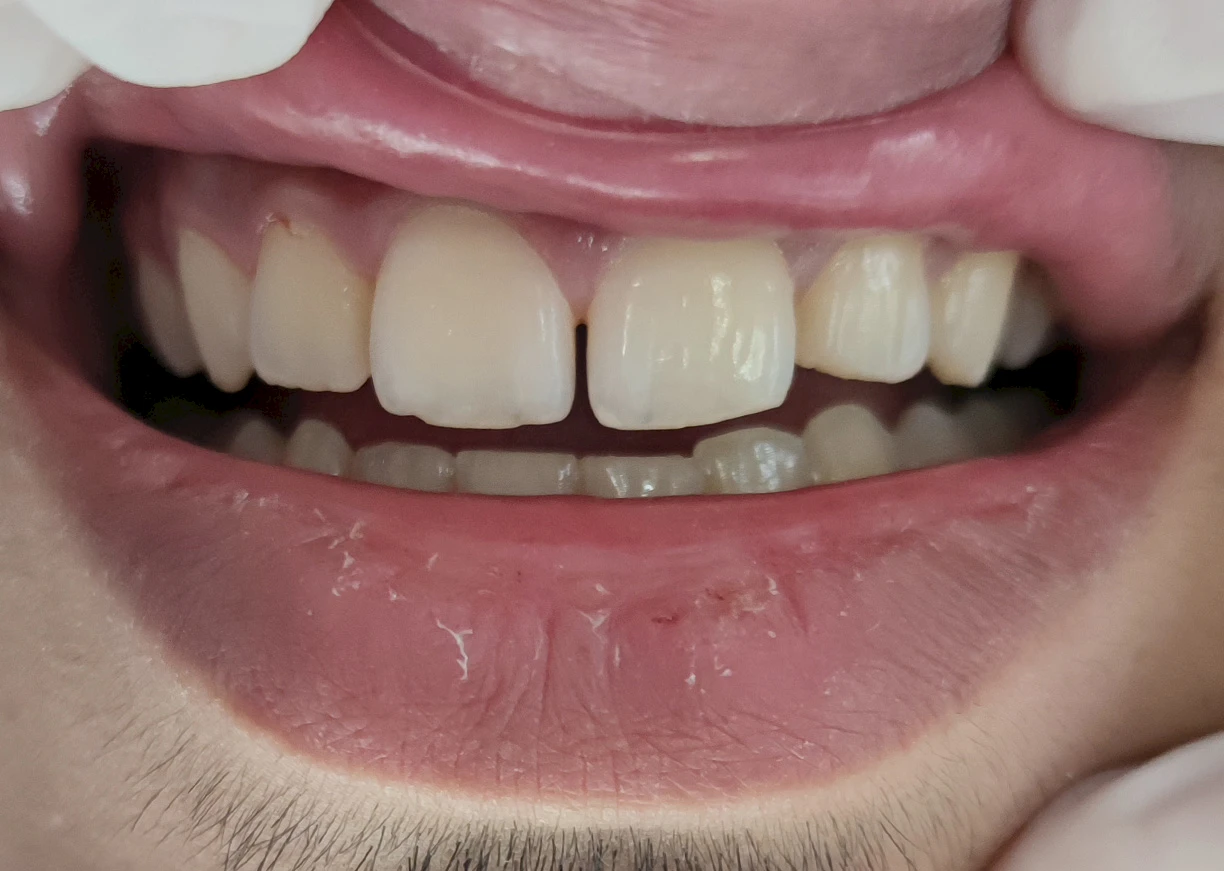 Dieses Foto zeigt die erstaunlichen Ergebnisse, die mit Laminatfurnieren erzielt werden können. Das Vorher-Foto der Patientin zeigt, dass zwischen ihren Vorderzähnen eine Lücke besteht. Das Nachher-Foto zeigt den Patienten, nachdem er Laminatfurniere erhalten hatte. Die Veneers haben die Zähne und das Selbstvertrauen des Patienten wiederhergestellt. Erleben Sie die transformative Wirkung von Porzellanlaminat-Veneers mit Vorher-Nachher-Bildern, die eine verbesserte Ästhetik des Lächelns und korrigierte Zahnfehler zeigen. Erleben Sie den Selbstvertrauensschub und das strahlende Lächeln, die durch personalisierte Veneer-Behandlungen erreicht werden.